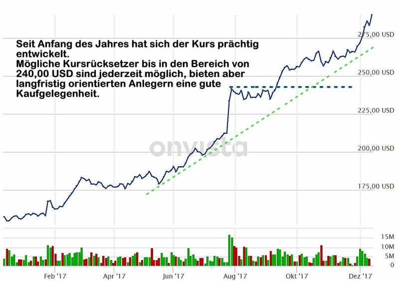 Konservative Anleger sollten auf einen Rücksetzer warten; im Bereich von 240-250 USD würde sich eine attraktive Chance für ein Langfristinvestment eröffnen.