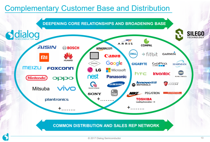 Was nach den dramatischen Entwicklungen der letzten Tage untergegangen ist war die durchaus viel versprechende Übernahme von Silego Technology, einem führenden Unternehmen im IoT und Consumer-OEM Markt, mit namhaften Kunden wie GoPro, Fitbit, Nike usw. Für diese Übernahme bezahlte Dialog knapp 300 Mio. US$ in bar und halbierte so den in den letzten Jahren angehäuften Barmittelbestand. Der Umsatz von Silego wird 2017 bei rund 80 Mio. US$ liegen und würde bei entsprechendem Wachstum 2018/19 sicherlich einen Teil der möglichen Umsatzausfälle von Apple ausgleichen.