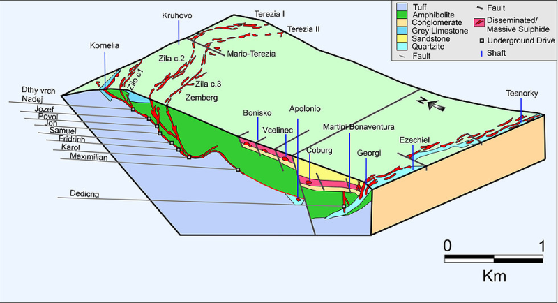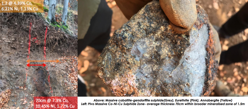 Höhere Konzentrationen erreichten Werte von bis zu 8% Co und 17% Ni, zusätzlich zu Mineralisierungen von 1-7% Cu und 200-900 g/t Ag im nördlichen (Zemberg-Theresien)-System.