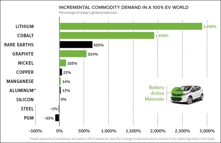 Bei einer Marktdurchdringung von 100% Elektrofahrzeugen würde sich der Bedarf an allen Batteriemetallen vervielfachen.