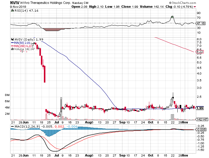 Fundamental ist das Papier bei 9,3 Millionen ausstehenden Aktien per 01.11.18 und einem Kurs von aktuell 1,99 USD bestens abgesichert, denn InVivo hatte zum Ende des dritten Quartals 19,7 Millionen $ in der Kasse, bei einem Eigenkapital in Höhe von 18,5 Millionen $.
